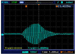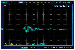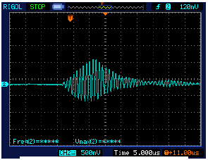 在超聲波流量測量時,首先要對換能器進(jìn)行驅(qū)動,激勵換能器產(chǎn)生振蕩并發(fā)出超聲波信號,以下是分別采用1個驅(qū)動脈沖、10個驅(qū)動脈沖和15個驅(qū)動脈沖作為換能器的激勵源,圖2是1個驅(qū)動脈沖時,接收端換能器所接收到的波形。可以看出,當(dāng)一個脈沖驅(qū)動時,所接收到的波形比較微弱,波形很不規(guī)范。圖3是10個驅(qū)動脈沖時,接收端換能器所接收到的波形。波形形狀得到明顯改善。圖4是15個驅(qū)動脈沖時,接收端換能器所接收到的波形。