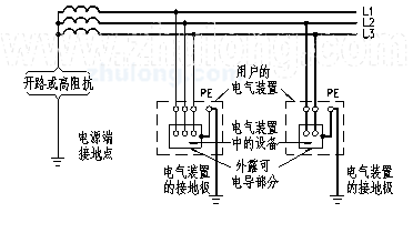 電源端的帶電部分不接地或有一點通過高阻抗接地,電氣裝置的外露可電導(dǎo)部分直接接地(見圖1-5)。