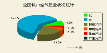 7月7日全國城市空氣質(zhì)量日?qǐng)?bào)對(duì)全國城市空氣質(zhì)量狀況的檢測結(jié)果做了詳細(xì)的介紹,其中監(jiān)測指標(biāo)為空氣質(zhì)量指數(shù),即air quality index(AQI)。其中,3.1%的城市為重度污染,6.2%的城市為中度污染,19.3%的城市為輕度污染,62.1%的城市空氣質(zhì)量為良,僅有9.3%的城市空氣質(zhì)量為優(yōu)。