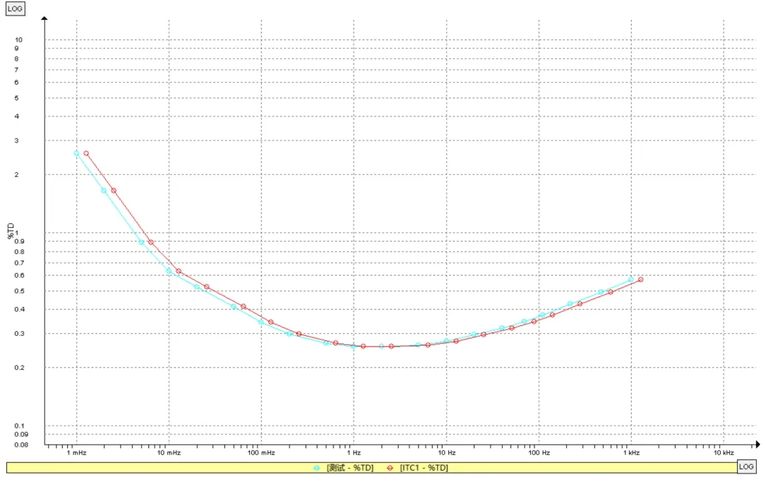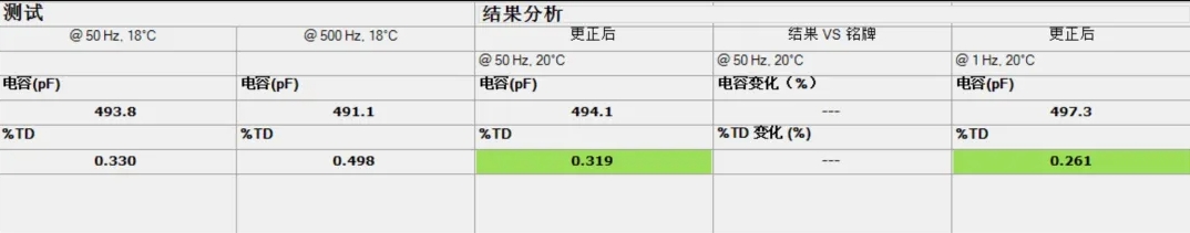 介質(zhì)譜分析測(cè)試的是各個(gè)不同頻率下的電容值和介損值,并繪制成電容和介損的頻率曲線。介質(zhì)譜曲線能夠更為清晰地反映絕緣的狀態(tài),并且有助于判斷測(cè)試結(jié)果是否存在異常。介損隨頻率改變,從左到右頻率逐次增大。可以看到,測(cè)試結(jié)果曲線與模型曲線十分平滑且基本一致。模型曲線與測(cè)試曲線有偏移的原因是溫度不同。